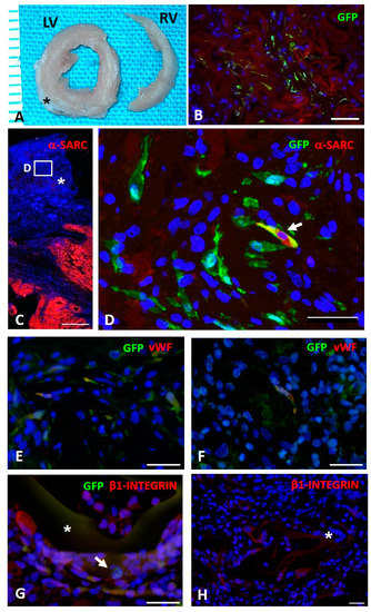 For these purposes, LV sections from different experimental groups were incubated with primary antibodies (polyclonal goat anti-GFP (ab6673), dilution 1:100, Abcam; monoclonal mouse anti-α-SARC (A2172), dilution 1:100, Sigma Aldrich; polyclonal rabbit anti-vWF (A0082), dilution 1:100, Dako; monoclonal rabbit anti- β1-integrin (ab52971), dilution 1:250, Abcam). FITC- and TRITC-conjugated specific secondary antibodies were used to simultaneously detect epitopes.