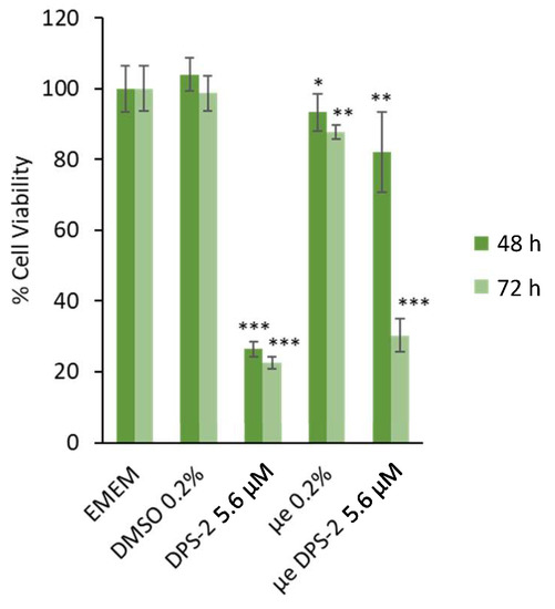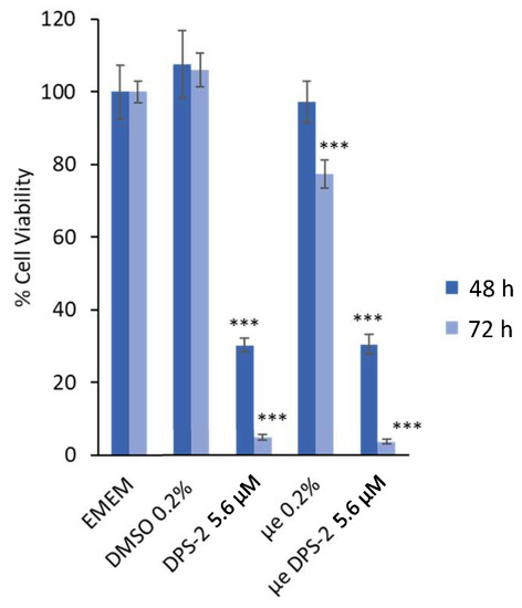 Prior to treatment, empty and loaded microemulsions were diluted in the cell culture medium (EMEM) at a ratio of 0.2% v/v, as previously described [17,19]. The final concentration of DPS-2 in cell culture medium was 5.6 μΜ, either encapsulated in microemulsion or diluted in DMSO. Figure 2 and Figure 3 show the percentage of cell viability in SK-MEL 28 and WS1 cell cultures, respectively, 48 and 72 h after the treatment onset. EMEM and DMSO 0.2% v/v were used as positive control samples in all cases.