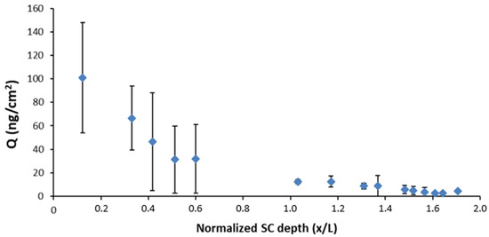 Representation of the quantity of DPS-2 (ng/cm2) in relation to the normalized SC depth.
