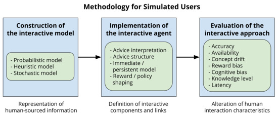 Although previous works have already employed simulated users in other contexts such as spoken dialogue systems [49] or video games [55], they have been employed in an unstructured manner. For instance, in [16] an artificial parent-like trainer agent (with cognitive bias) is proposed as a simulated user in order to train other learning agents during the apprenticeship process in a domestic task. In this experimental setup, different probabilities and consistencies of feedback are tested (equivalent to availability and accuracy respectively). The simulated users in this work are proposed with no structure, this is a common issue that we have observed in previous works employing simulated users [49,55]. In this regard, our methodology may fit with previous work definitions. In the example using a parent-like trainer agent, with our methodology, the representation of human-sourced information would be a stochastic model, the definition of interactive components and links would be state-action par advice with an immediate model and policy-shaping, and the alteration of the human characteristics would be the accuracy, availability, and the cognitive bias.