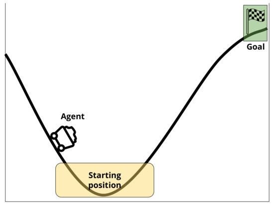 The agent’s state s consists of two state variables, position and velocity, which are represented as real numbers. The position is the agent’s position within the environment, and is the velocity of the agent. A velocity greater than zero indicates the agent is travelling to the right or increasing its position. In this scenario, 2 actions are possible, accelerating the car either to the left or the right. At each step, the agent receives a reward R of , and no reward when reaching the goal state, as shown in Equation (1). The agent was given a learning rate of 0.25, a discounting of 0.9, and used an -greedy action selection strategy with .