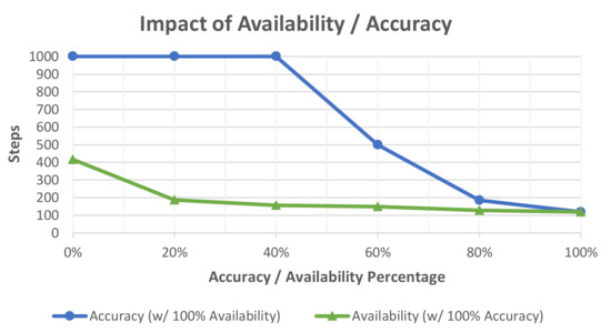 Impact of accuracy and availability on the agent performance. The interactive reinforcement learning agent uses a simulated user with different levels of availability and accuracy. For each characteristic, an increment of 20% is set for each experiment and the total average steps are shown.