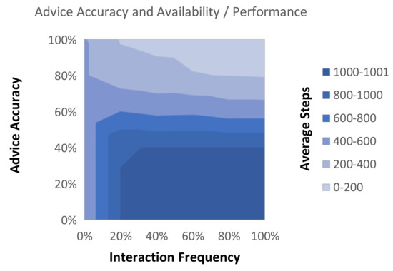The contour graph shown in Figure 6 is a method for presenting the relationship between two characteristics of human-sourced information and their effect on the performance of the agent. In Figure 6 the average steps of the agent are plotted, showing the change in performance which is observed as the simulated users’ accuracy and availability are altered. From this figure, some observations can be made regarding how the accuracy and availability of the user impact the average performance of the agent. For example, it can be observed that just a small amount of advice can have a large impact on the agent’s performance; however, there are diminishing returns as frequency increases. The figure also shows that inaccuracy of advice has less of an impact as the frequency of advice is increased. From these observations, it may be concluded that a small amount of largely accurate advice is enough to greatly accelerate agent learning.