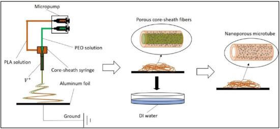 A schematic illustration of processing the electrospun microtubes is shown in Figure 1. By adopting the coaxial spinneret, PLA/PEO and PEO solutions were electrospun simultaneously into microfibers with a core-sheath structure. The porous microfibers were collected by aluminum foil and immersed in deionized water for 2 h to dissolve the PEO. After the water bath, the core was removed and the sheath was thinned, resulting in porous microtubes.