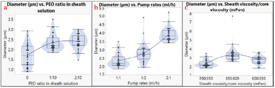 Diameter analysis. Effects of (a) PEO ratio in sheath solution; (b) pump rates; (c) sheath viscosity/core viscosity.