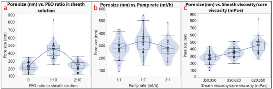 Pore size analysis. Effects of (a) PEO ratio in sheath solution; (b) pump rates; (c) sheath viscosity/core viscosity.