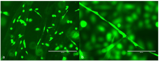 GFP human dermal microvascular endothelial cells (HDMVE) attached on the electrospun microtubes. (a) Cells randomly distributed on the microtubes, scale bar = 400 μm; (b) cells grown along a single microtube, scale bar = 200 μm.