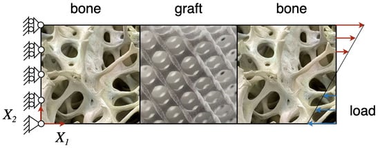 The system under study is constituted by a trabecular bone tissue to which an artificial graft, with a similar microstructure, is added to facilitate the healing process following a dire injury or a fracture. The main aim of the graft is to provide a junction that restores the mechanical continuity of the broken bone and a scaffold that allows the bone-cells responsible for the remodeling process to operate in resorbing the extraneous bio-material and substituting it with freshly produced bone. Since in this paper, we examine a preliminary case to illustrate as the proposed model can be beneficial from a computational point of view, bone is treated in general terms. Namely, no distinctions are made concerning the particular kind of bone (i.e., long bones, flat bones, etc.). The only hypothesis we consider is that the bone is trabecular because, in this case, the size-effect that a second gradient model can describe could be more evident. We are well aware that the effects of mechanical usage and biochemical agents probably occur at different rates and in various proportions for diverse skeleton regions. However, the hypotheses beneath this formulation are pervasive for all kinds of bone. From a modeling viewpoint, both the bone and the artificial graft can be described by a porous material. This is quite natural in the bone case, while some remarks should be made for the graft. Indeed, the bone tissue is characterized by different kinds of porosity, significant at various scales of observations, namely inter-trabecular, vascular, lacunar-canalicular, and collagen-apatite porosity [,]. In the case of the graft, instead, we can design it to the best following a suitable criterion that depends on the particular case examined. In most clinic cases, the objective is to use the graft as temporary support for the cells involved in the remodeling process that, at the end of the healing, will result in a more or less complete substitution of the graft with healthy bone. This perspective demands a graft as a material with inner cavities, recommendably interconnected, to supply the remodeling cells with the room to be able to carry out the process to which they are predisposed as well as with their nutrients.
