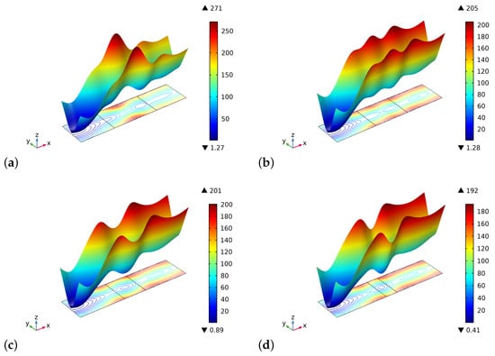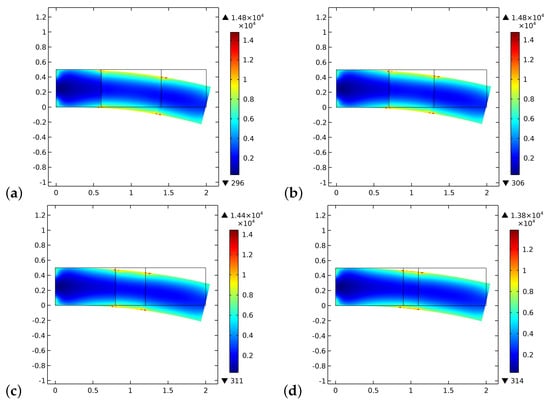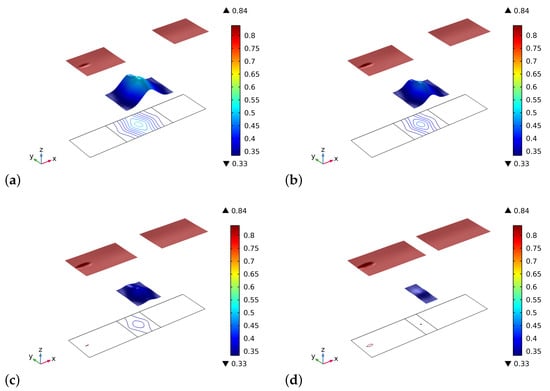 The distribution of at the end of the time of simulation for different substitute lengths of the graft: (a) 0.8 cm. (b) 0.6 cm. (c) 0.4 cm. (d) 0.2 cm.