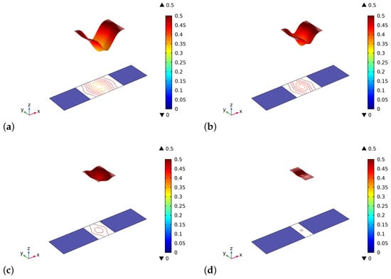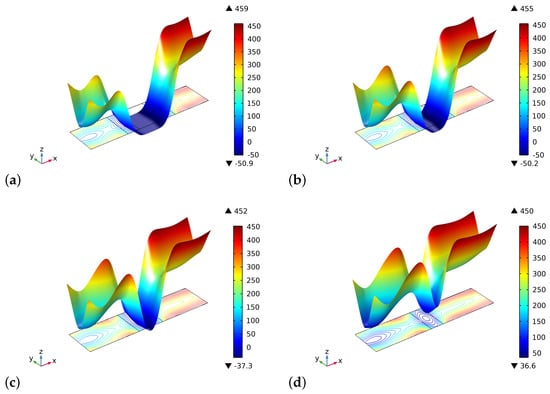 The distribution of the energy density at the beginning of the time of simulation for different substitute lengths of the graft: (a) 0.8 cm. (b) 0.6 cm. (c) 0.4 cm. (d) 0.2 cm.