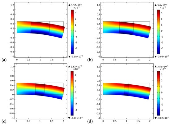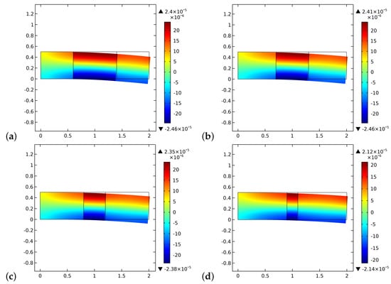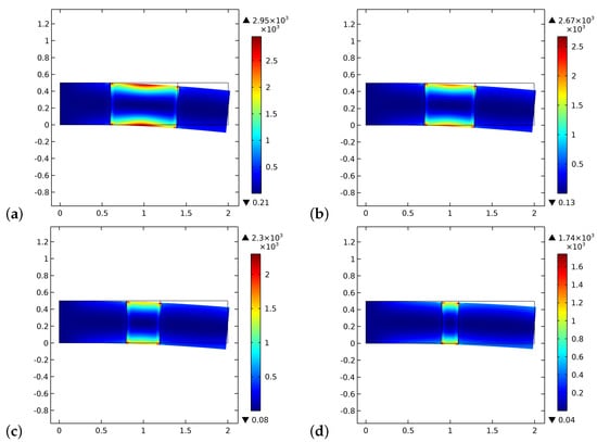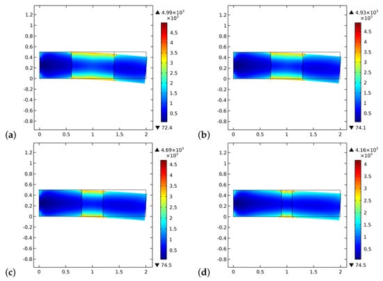 The distribution of the energy density at the end of the time of simulation for different substitute lengths of the graft: (a) 0.8 cm. (b) 0.6 cm. (c) 0.4 cm. (d) 0.2 cm.