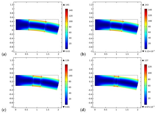 The distribution of the dissipated energy density at the end of the time of simulation for different substitute lengths of the graft: (a) 0.8 cm. (b) 0.6 cm. (c) 0.4 cm. (d) 0.2 cm.