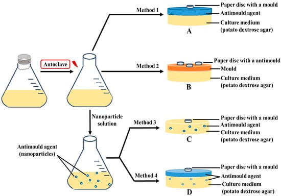 Schematics of the four different settings of application of the functionalized antimould CuONPs nanoparticles to the mould species explored in this study: (A) Method 1 involved spreading liquid antimould formulation on a potato dextrose agar (PDA)–gel plate and placing a paper disc impregnated with a mould suspension in the center. (B) Method 2 involved spreading the mould suspension over the whole PDA–gel plate surface and then placing a paper disc impregnated with antimould agent in the center. (C) Method 3 involved mixing of the liquid PDA-media with the antimould formulation, gelling it and placing a paper disc impregnated with a mould suspension in the center. (D) Method 4 was a combination of Method 1 and Method 3 and involved mixing the liquid PDA with the antimould formulation, gelling it and then spreading a sample of liquid antimould formulation on top of the PDA–gel plate. The method also included placing a paper disc impregnated with a mould suspension in the center of the gel plate. The PDA gel plates were then placed vertically, to eliminate any excess liquid on the gel surface.