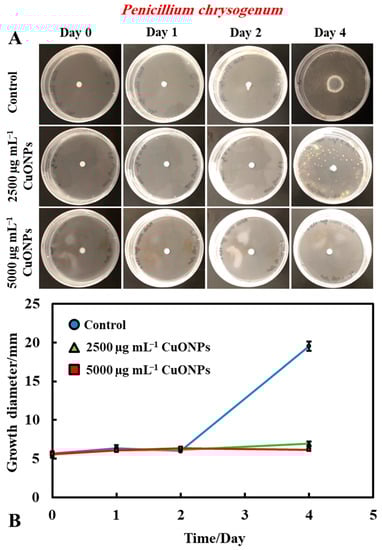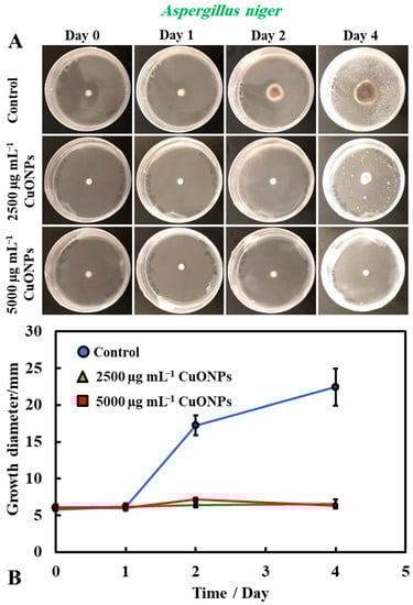 It was found that bare CuONPs on their own had a significant antimould activity against P. chrysogenum at concentrations of 2500 and 5000 µg mL−1 and suppressed the mould growth. The same experiment was repeated with A. niger, to check if the bare CuONPs are also a good antimould agent across different mould species (Figure 3A,B). Here, we found a similar trend to the experiment with P. chrysogenum. The control sample of this mould was kept at the same conditions without treatment with the antimould agent for the same period. In controls, the mould colony grew after day two to 16 mm in diameter. It was found that the growth rate of A. niger decreased significantly, compared with the control (Figure 3B). The data in Figure 3 show that the growth spot vs. time did not change significantly from days two to four, apart from the control. All tested CuONPs concentrations used seem effective in subduing the mould growth. The bare CuONPs were found to be effective antimould agent, as A. niger did not spread on the PDA plates at CuONPs concentrations of 2500 and 5000 µg mL−1, respectively, and the growth diameter stayed around 5 mm. The growth rate of both P. chrysogenum and A. niger also decreased with the increase of the antimould-agent concentration. This effect can be explained with the positive surface charge of the bare CuONPs, which are cationic particles at neutral pH [] (see Supplementary Materials Figure S2), and their strong electrostatic attraction to the anionic surface of the mould hyphae. It is likely that, due to their surface roughness, the adhered CuONPs fracture the cell membranes, as recently established for several bacterial species, as well as yeast [,,,,].