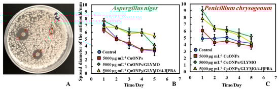 The antimould activity of the CuONPs surface-functionalized with GLYMO and 4-HPBA was also tested against both moulds (P. chrysogenum and A. niger) at 5000 µg mL−1 concentration of the antimould agent. In this method, we deposited three paper discs impregnated with the antimould agent (Figure 4A). Here, Method 2 was used (see Figure 1) where the seeding with mould spores was done over all the surface of the PDA–gel plate initially, while the filter paper disks were impregnated with the antimould NPs formulation. The obtained trend is just the opposite to the results presented on Figure 3 where Method 1 was used. Therefore, the antimould effect is proportional to the diameter of the void space around the disk. One can see that the NPs treated filter paper disks show very large voids around which corresponds to more effective antimould action for CuONPs/GLYMO/4-HPBA. Note that a space void of mould growth developed around the paper disc, showing that Method 2 was also a good way to conduct the testing. It was found that the surface-functionalized nanoparticles (CuONPs/GLYMO/4-HPBA) displayed a strong antimould activity against both P. chrysogenum and A. niger (Figure 4B,C).