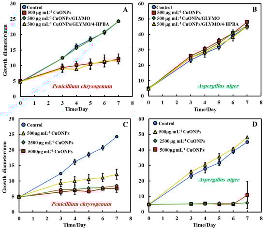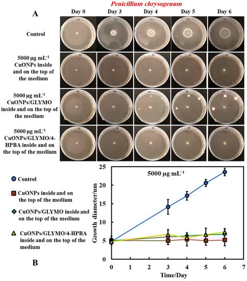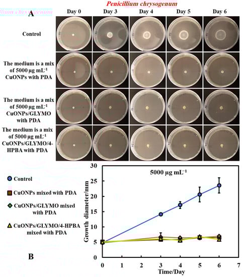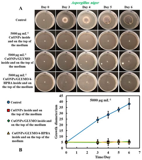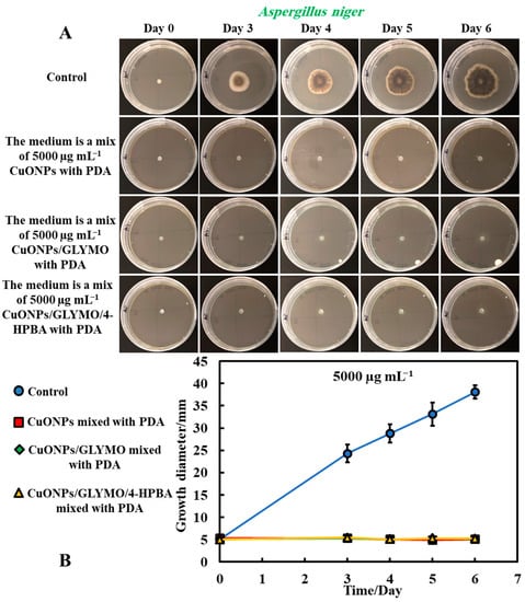 The same procedure used in Method 3 was followed as described above. Method 3 worked very well with mixing of the antimould agent (CuONPs suspensions) with the PDA media. To further strengthen the antimould action, we mixed the antimould suspension with the PDA media while hot and in liquid state, and after its gelling, we also added a liquid antimould agent on the top of the gelled medium, as described in Method 1. In this way, we had the antimould agent both in the bulk of the growth media and on its surface. Figure 8 and Figure 9 demonstrate the antimould impact of the suspensions of bare CuONPs, CuONPs/GLYMO and CuONPs/GLYMO/4-HPBA at different particle concentrations on P. chrysogenum and A. niger at different times. The green line and symbols in Figure 8 indicate that the GLYMO-functionalized CuONPs are as effective as the 4-HPBA/GLYMO functionalized CuONPs due to the high overall concentration. Control samples of P. chrysogenum and A. niger were kept at the same conditions without treatment with antimould agent for the same period. The data in Figure 8 and Figure 9 indicate that the bare and surface functionalized CuONPs have an extremely strong impact on P. chrysogenum and A. niger. The growth rate of the P. chrysogenum decreased after day six. As it can clearly be seen, on day six, the growth diameter was around 5 mm, compared with the control samples of diameter 24 mm (Figure 8B). The explanation is that, in Methods 3 and 4, where the antimould formulation is applied in the bulk of the PDA–gel, the hyphae of both types of mould cannot grow within, and this has a strong effect on their propagation—the latter was well suppressed for all formulations, over four days.