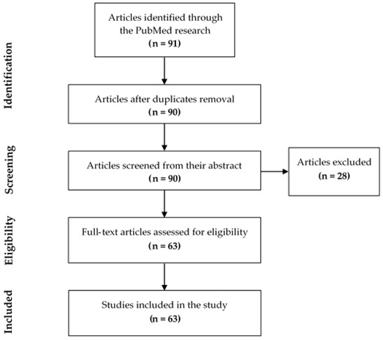 Duplicate articles were excluded (one article). Then, the title and abstract of each of the remaining 90 articles were examined allowing the exclusion of 28 articles that did not meet the inclusion criteria (Figure 2). The exclusion reason for each article is described in Table 2. Finally, 63 relevant articles were investigated by reading the full text (Table 3).