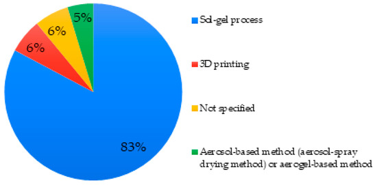 Eighty-three percent of the MBGs studied were synthesized by the sol-gel process. More rarely, a synthesis assisted by an aerosol or aerogel method was reported (5%), making it possible to produce ordered mesoporous microspheres with a high degree of sphericity and an ordered mesostructure [112]. These different techniques were found in articles describing micro- or nano-MBGs [66,69]. In general, the sol-gel process was found to be employed for all sizes and morphologies of MBG. Finally, in 6% of cases, MBGs were synthesized by 3D printing via so-called additive manufacturing (Figure 3).