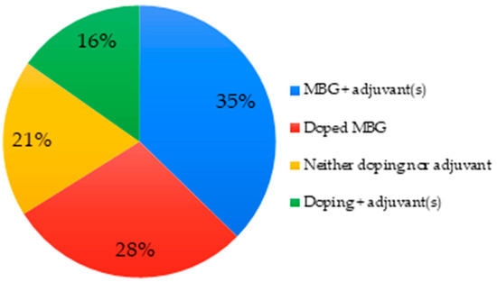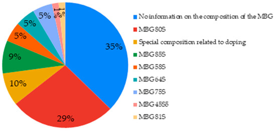 The composition of the MBG was not specified in 35% of cases, even in the associated references; in such cases, the assessment or the comparison of any effect of composition cannot be discussed. The compositions which returned most often (29%) were the MBG 80S15C (80SiO2: 15CaO: 5P2O5) and 80S16C (80SiO2: 16CaO: 4P2O5). More rarely, specific compositions related to doping (10%) or MBG compositions 85S15C (85SiO2: 15CaO) were found (Figure 4).