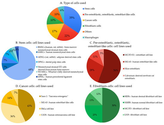 (A–E). Primary cells and cell lines used to assess cytocompatibility in the studied articles.