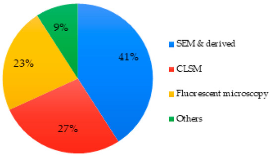 About 27% of articles investigated the modifications of cell morphology. Microscopy was the technique used by all, for example, scanning electron microscopy (SEM) was the primary choice, followed by confocal laser scanning microscopy (CLSM) and fluorescence microscopy, which was used in a lesser proportion of studies. Transmission electron microscopy (TEM) and inverted optical microscopy were also found to a lesser extent (Figure 7).