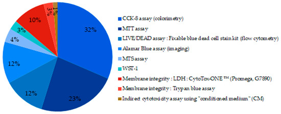 Eighty-six percent of the tests used were metabolic based assays. They are illustrated by the shaded blue portions in the graph (Figure 9). CCK-8 (Cell Counting Kit-8) assay uses a salt further reduced by active metabolic cells via dehydrogenase enzymes. The reduction product obtained is colored and its concentration is determined by colorimetric measurements. It is by far the technique most widely reported in the studies. The MTT (3-(4,5-dimethylthiazol-2-yl)-2,5-diphenyltetrazolium bromide) assay and the Alamar Blue assay that require different enzymes and reagents but follow the same oxide-reduction reaction were also reported. The LIVE/DEAD staining was used in 12% of the studies, it is a membrane integrity-based assay, and results are revealed by fluorescence measurement. Pintor et al. compared MTT assay to other cell viability assays and found that MTT and XTT (2,3-bis-(2-methoxy-4-nitro-5-sulfophenyl)-2H-tetrazolium-5-carboxanilide) assays do not induce over- or underestimation of the cell viability and were in at least moderate agreement with other cell viability assays when the root canal filling materials were screened [122].