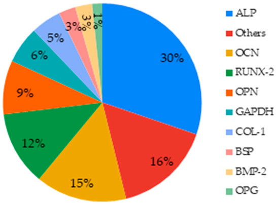 Twenty-eight articles indicate the use of stem cells (Figure 6A) to perform biocompatibility tests in which about 3/4 were BMSCs (bone marrow mesenchymal stem cells) derived from different mammals (human, rat, rabbit) (Figure 6B). Eighteen articles indicate the use of pre-osteoblastic, osteoblastic, or osteoblast-like cells (mostly from animal origin). Fifty-six percent used MC3T3-E1 type cells and 28% used cells from MG-63 lines (Figure 6C). Fourteen articles indicate the use of cancer cells (Figure 6A); among them 43% were Saos-2 (“Sarcoma osteogenic”) (Figure 6D). Eight articles indicate the use of fibroblasts cells, half were HDFs (human dermal fibroblast) cells (Figure 6E). From a clinical perspective, the cell type should be carefully chosen according to the targeted medical application.