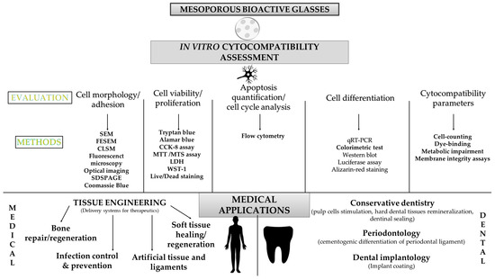 As MBGs represent a new generation of conventional bioactive glasses with unique properties (high surface area and high porosity) and have the potential for use across a large spectrum of medical applications, important questions should be addressed concerning the evaluation of their biocompatibility. Since the prime focus of researchers is the development of improved bioactive glasses that are mainly safe and suitable for industrial and clinical use, the aim of this review was therefore to identify and rank the different methods used for the MBG biocompatibility assessment in vitro.