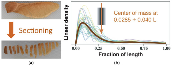 (a) A Norway maple seed (Acer platanoides) is sliced into sections and weighed in order to estimate the spanwise linear mass density, that is, mass per unit spanwise length, (b), shown on a relative scale for 30 natural Norway maple seeds, as well as an average (thick line). With the spanwise length denoted as L, the center of mass was found to be located slightly more than a quarter of the way from the heavy (seed) end, more precisely, at 28.5 ± 4.0% L.