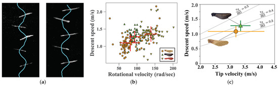 To determine the natural descent properties of all samaras tested, artificial and natural, we dropped the samaras in a still air setting, as in [30]. Samaras were released from rest, with the blade pointing downward, from a height of 3.05 m, and allowed to fall freely. Tests were conducted in a laboratory (a growth chamber) without active ventilation, to minimize air currents that could disrupt the measurements. Each individual samara was tested 3 times (i.e., 90 samaras, each dropped 3 times, giving 270 total drops). A Photron FASTCAM Mini UX100 camera (Photron, San Diego, CA, USA) with a micro-Nikkor 105 mm f/28 lens (Nikon, New York, NY, USA) was used to record video data at 2000 frames per second (0.5 ms between frames) with a resolution of 1280 × 800 pixels. The resulting images were analyzed to determine the mean descent speed and rotational velocity at steady state, as illustrated in Figure 3a. Video frames were processed using a combination of background subtraction, median filtering, and thresholding with scikit-image and opencv for Python to track samara position and orientation.