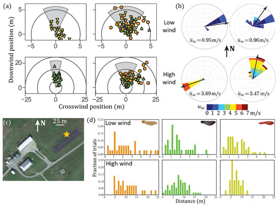 During the high wind trials, the landing distribution shows a significant bias to the right of downwind (Figure 4a). This may be due to temporally localized turbulent gusts, which were biased to the right of the mean wind direction during the trial duration (Figure 4b). This is consistent with the high variability of the wind direction during this trial.
