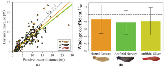(a) The downwind distance traveled plotted against the effective downwind distance of a passive tracer during the same drop time. The ratio of these distances gives the windage coefficient, plotted in (b) for each of the three cases, with error bars giving standard deviation. The mean windage coefficient for each data set is shown by the straight line fit in (a).