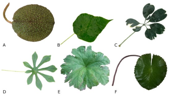 Variety of peltate leaf shapes (according to Troll, 1932 and Ebel, 1998 [18,20]). (A)—orbicular entire (Euryale ferox), (B)—ovate entire with pointed apex (Macaranga tanarius), (C)—palmately compound with leaflets (Schefflera arboricola), (D)—palmatipartite (Cecropia peltata), (E)—palmatifid (Darmera peltata), (F)—orbicular crenate toothed (Nymphaea lotus). (A,E)—central petiole insertion, (B–D,F)—eccentric insertion of petiole.
