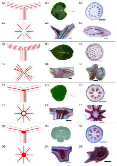 While some studies are available on the morphology and anatomy of peltate leaves and their petioles [19,20,21,22], the transition zone from the petiole to lamina has been analysed so far only in a single study by Sacher et al. (2019) [13]. Focusing on two peltate plant species (one from Araceae and one from Tropaeolaceae), the study identified two different variants of strengthening structures present in the compact transition zone [13]. These structures represent two types of branching of the vascular strands, which have been shown to act as a stabilising element. Such biological strengthening structures may have great potential as the inspiration for applications in lightweight construction [13].