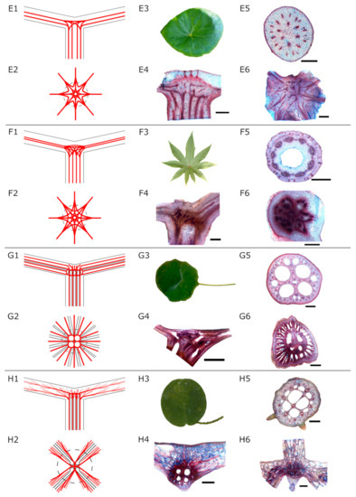 Types of strengthening structures in the petiole–lamina junction of peltate leaves (part 1). (A)—unbranched type (Piper peltatum, scale: 1 mm). (B)—monocot branching type (Anthurium forgetii, scale: 1 mm). (C)—ring-like structure (Stephania delavayi, scale: 500 µm). (D)—knot-like structure (Tropaeolum tuberosum, scale: (D4,5)—500 µm, (D6)—1 mm). (E)—net-like structure, intensity 1 (Begonia nelumbiifolia, scale: (E4), (E6)—2 mm, (E5)—1 mm). (F)—net-like structure, intensity 2 (Ricinus communis, scale: 1 mm). (G)—water plant radial branching type, (Nelumbo nucifera, scale: (G4)—5 mm, (G5)—1 mm, (G6)—2 mm). (H)—water plant diffuse branching type (Victoria cruziana, scale: (H4), (H6)—2 mm, (H5)—1 mm). 1—simplified illustration of strengthening structure type, longitudinal section of petiole and transition zone. 2—simplified illustration of strengthening structure type, top view of petiole (dashed line) and transition zone. 3—leaf morphology of peltate representative. 4—longitudinal section of the transition zone. 5—cross section of the petiole. 6—cross section of the transition zone.
