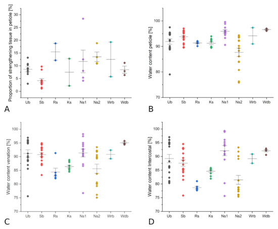 Proportion of (lignified) strengthening tissue in petiole (A) and water content of petiole (B), venation (C) and intercostal areas (D) in % of the different types of strengthening structures in peltate leaves (with mean and standard error). Abbreviations for strengthening structures: Ub—unbranched, Sb—simple branching, Ns1—net-like structure, intensity 1, Ns2—net-like structure, intensity 2, Ks—knot-like structure, Rs—ring-like structure, Wdb—water plant diffuse branching type, Wrb—water plant radial branching type.