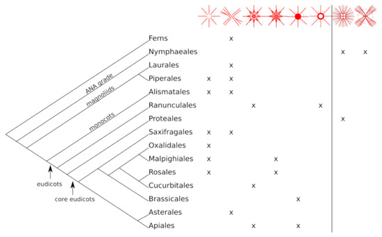 - Cole, T.C.; Hilger, H.H. Angiosperm Phylogeny Poster–Flowering Plant Systematics; Freie Universität: Berlin, Germany; Missouri Botanical Garden: St. Louis, MO, USA, 2019. [Google Scholar]