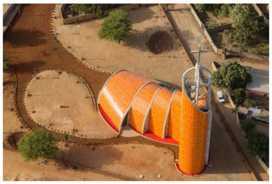 We identified that 44% (n = 7) of the projects have been accepted by the project owners and are built or under construction. Examples in this category are the Nianing Church, a concluded project located in Senegal (Figure 1). This project finds inspiration in the termite mounds model aiming at passive thermal regulation, a well-described biological model successfully applied in previous projects as the CH2 and the Eastgate Center []. Another example is the Quartier de Gally project, a neighborhood under construction that aims at natural ecosystems as models to promote a neighborhood that better integrate urban spaces and nature.