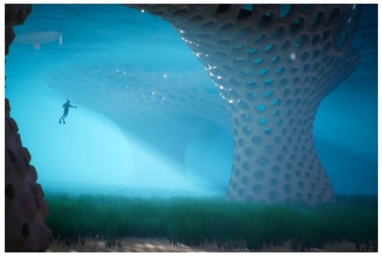 A quarter of the projects (n = 4) have been accepted but are not constructed and not under construction. It includes conceptual projects, as the Biolum_Reef, a project that aims to create autonomous human habitat in the sea, presenting bioluminescent bio-inspired technologies and contributing to ocean decontamination and natural habitat provision (Figure 2). This category includes also projects accepted by the client and further abandoned, as the Residence Solaire d’Ordener, a project in which the building orientations were calculated using a solar phyllotaxis algorithm to optimize sunlight exposition, and, finally, projects still in executive design, as the Ecotone project that finds inspiration in transition ecosystems recreating ecosystems services in the urban space.