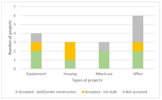 Furthermore, 31% (n = 6) of the projects were not accepted by the project owners. One example is the Osez Josephine project, a mixed-use project that finds inspiration in French forests, aiming for diverse vegetation strategies, more circular water and waste cycles and bioclimatic and evolutive buildings.