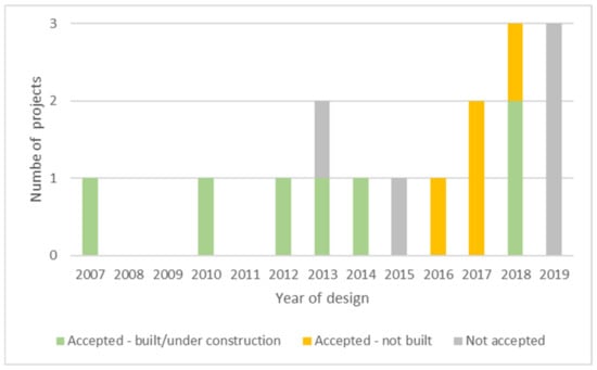 Figure 5 outlines this sample distribution over time and according to their design year and status. The oldest documented project in the report was designed in 2007. Between 2012 and 2016, the report presents at least one biomimetic project designed per year. Then, the number increases from 2017 to 2019. Nevertheless, since 2013, we also observe an increasing number of projects that did not reach implementation (not built or not accepted).