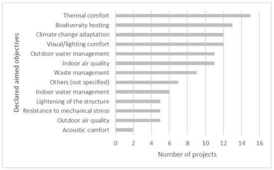 Figure 6 presents the frequency of declared objectives of the projects with their biomimetic approach. We can observe that six objectives were present in more than ten projects (62.5% of the sample): climate change adaptation, biodiversity hosting, outdoor water management, indoor air quality, visual and lighting comfort, and thermal comfort.