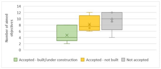 We observe that accepted and built or under construction projects in the sample tend to have a narrow focus on their objectives (Figure 8).