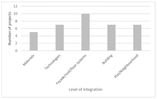 The projects’ most recurrent integration level of the biomimetic approach is at the façade/roof/floor systems (Figure 9). Ten projects applied some level of biomimicry at this level. Examples are the Tour D2 project with its exo-structure, the CIRC with its adaptative solar protections and the Alguesens project, which proposes a bio-façade with algae bioreactors, ensuring building thermal regulation and CO2 sequestration.