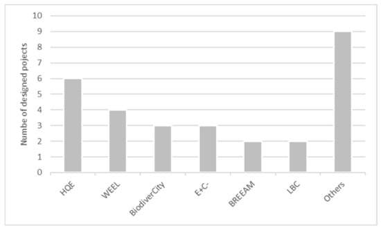To give visibility to their sustainable engagements and performances, ten projects from the sample (62.5%) highlighted labels that the projects aimed for or obtained. Fifteen different labels families have been cited, but only six have been cited more than once (Figure 12). We can find a higher presence of standard French market label families as HQE, E+C- and BiodiverCity. Nevertheless, innovative labels, not yet fully adopted by the French market, have been observed, as the LBC.