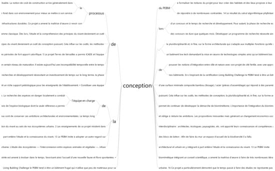 Figure 14 presents the interactive word tree for the word “conception” (design), the main identified keyword. The interactive word tree allowed us to identify passages and recurrent ideas presented by the designing teams.