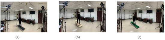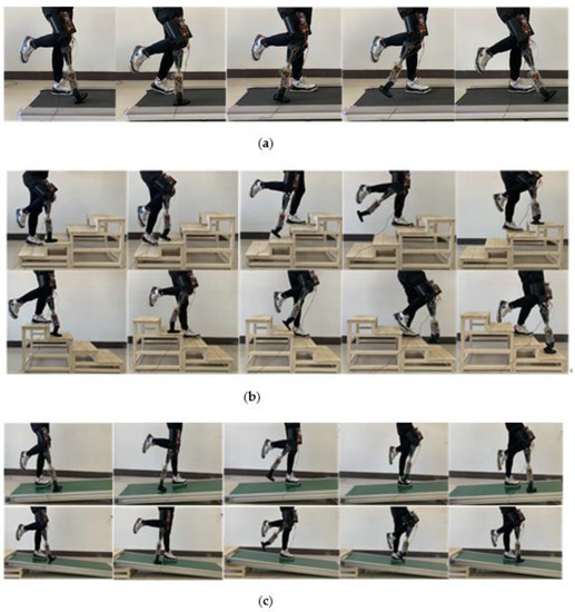 Prosthetic gait experiment. (a) Gait experiment of prosthetic flat walking (speed 1 m/s). (b) Gait experiment of prosthetic leg up and down steps (four steps). (c) Gait experiment of prosthetic ups and downs (gradient 5 degrees).