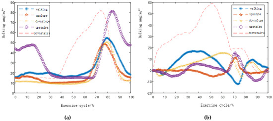 We collected motion data for five gaits of human walking on flat ground v = 1 m/s, uphill and downhill (5°), and up and down stairs (4th floor), and unified the time to obtain knee and ankle flexion angles such as Figure 6.
