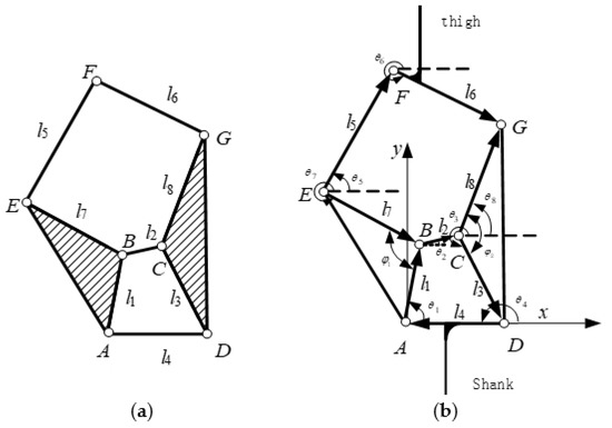 Based on the schematic diagram of the six-bar mechanism structure, a vector model of the knee prosthesis of the six-bar mechanism is shown in Figure 8b. The rod 4 is fixed on the X axis, and A is the origin of the coordinates to establish a Cartesian coordinate system. The 6-bar mechanism has a total of 10 parameters, which are eight rod lengths and two triangle initial angles (). Among them, represent the angle between each vector and the positive direction of the X axis. Thigh fix with bar 6, and the shank fix with bar 4. Establish vector equations for closed-chain motions of 4-bar and 5-bar mechanisms: