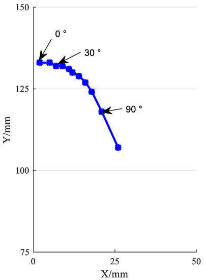 The center of rotation of a normal human knee joint changes with the change of the gait, which is a composite movement of sliding and rolling, so the instantaneous center curve with a J shape as shown in Figure 9 is formed [18], converted into coordinates (shank fixed) as shown in Table 1.